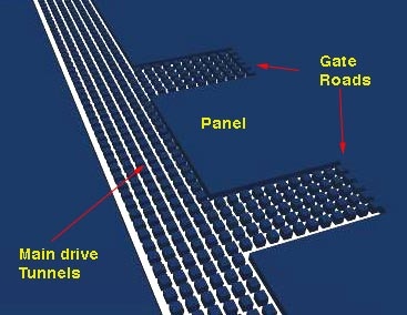 As the miners drove the tunnels (also called entries, headings, drifts, drives etc) into the coal they left pillars between the tunnels to hold the roof up. However in about 1870, and possibly in the Lancashire coalfield in the UK, they discovered that if they put these entries together, they could develop a way of getting all the coal out from that section (or panel). How could they get away with this?