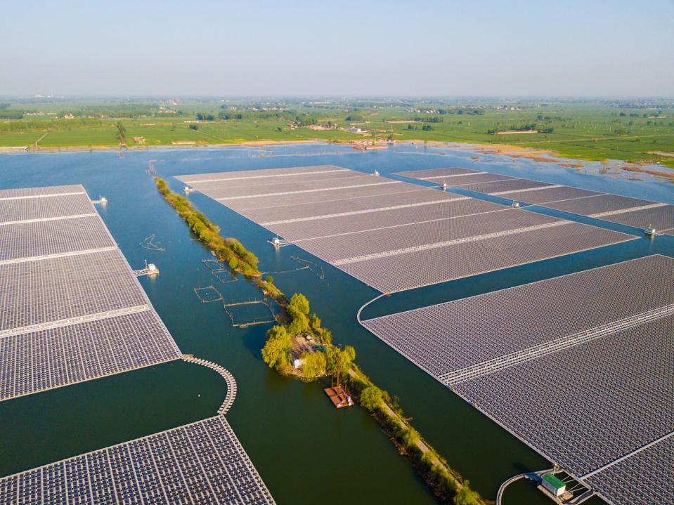 HUAIBEI, CHINA – APRIL 19: Aerial view of the floating solar power station on top of an abandoned coal mine at Nanping Village on April 19, 2018 in Huaibei, Anhui Province of China. (Photo by VCG/VCG via Getty Images)