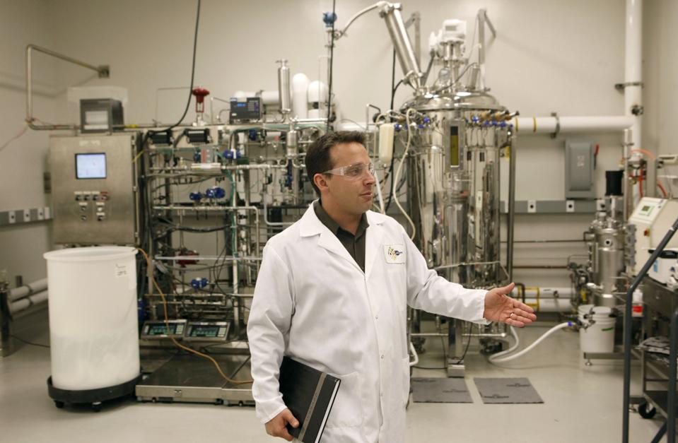 This caption from Monday, Oct. 11, 2010 did not age well: Jonathan Wolfson, CEO and co-founder of Solazyme, speaks to a reporter while standing in front of a 600 liter fermenter in the Solazyme pilot plant in South San Francisco, Calif. Many of the U.S. Navy’s ships and jets will soon be running on prairie grass, sugar beet pulp and sawdust that’s been eaten by microscopic algae and turned into fuel. The Navy has already started doing it on a small scale, and in September they ordered more than 150,000 gallons of algae fuel from South San Francisco-based Solazyme. (AP Photo/Jeff Chiu)