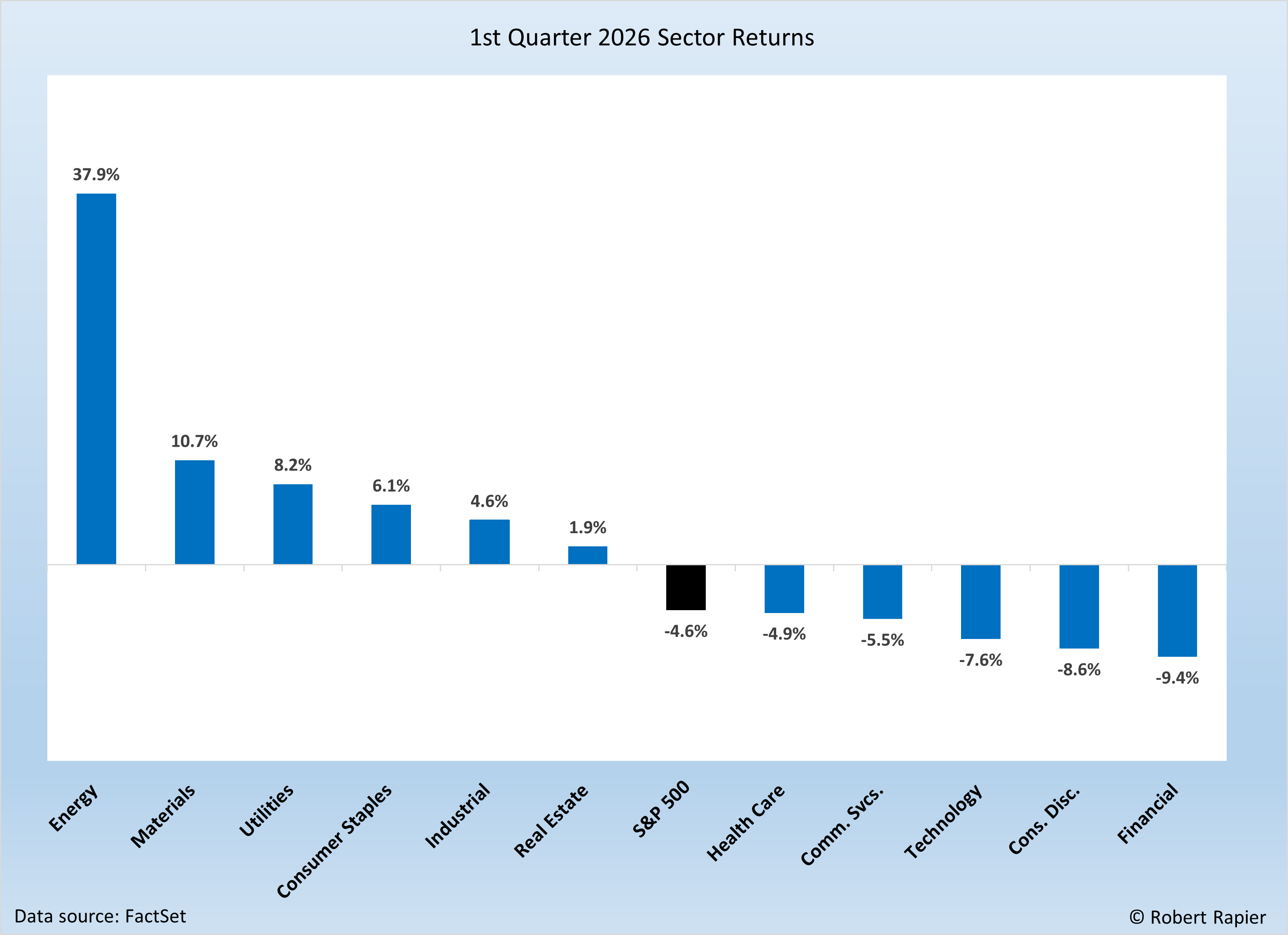 The first quarter of 2026 marked a sharp shift from the broad-based strength that closed out last year. The S&P 500 finished in negative territory as investors wrestled with a new war in the Middle East, stubborn inflation, shifting interest rate expectations, and uneven earnings across major industries.